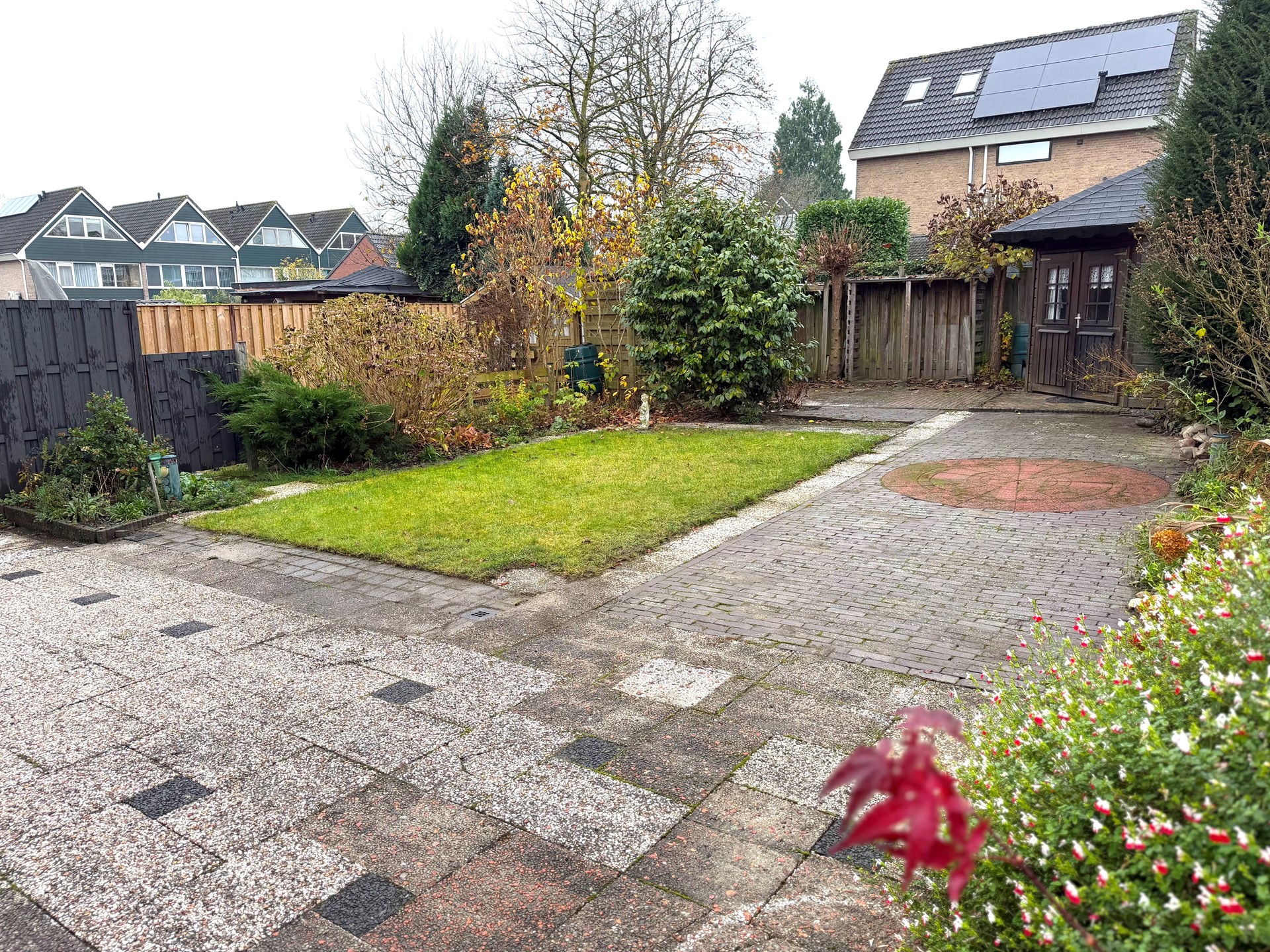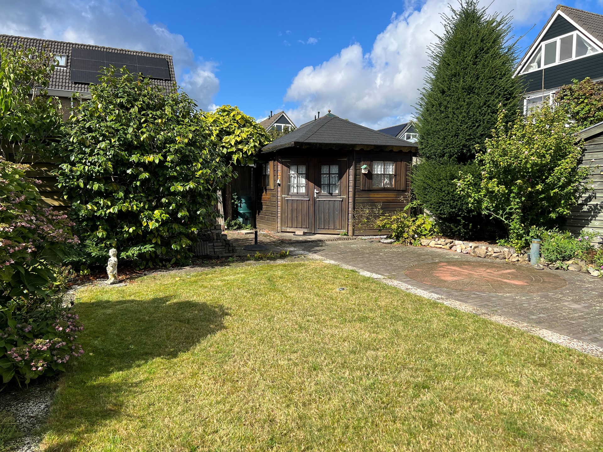 Diepe voor- en tevens een diepe achtertuin. Royale oprit geschikt voor meerdere auto's. Garage bereikbaar vanuit zowel de voor- als de achtertuin. Aparte houten berging in de achtertuin, deze is zonnig gelegen op het zuidwesten.