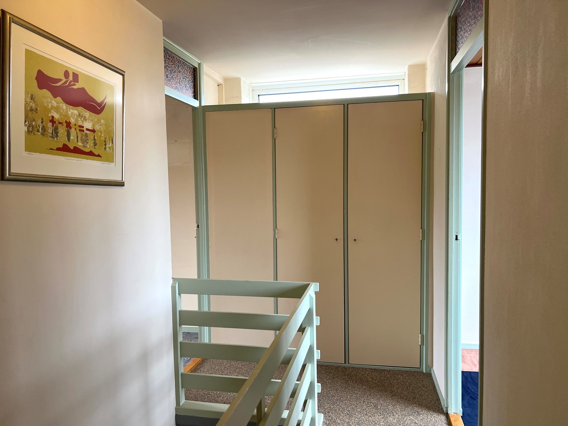 Overloop met vaste inbouwkasten. Drie ruime slaapkamers, waarvan 1 met airco. Complete badkamer met toilet, wastafelmeubel, douche en ligbad.