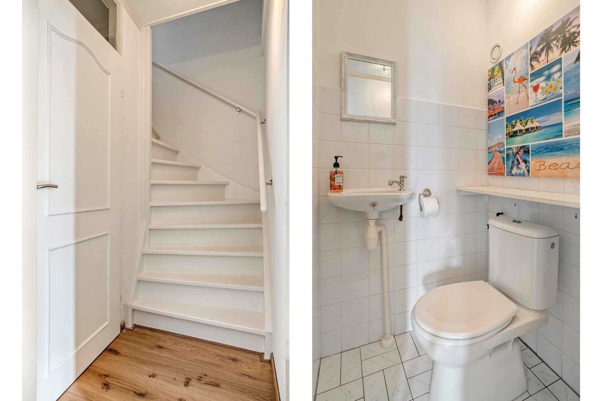 Tweede hal met een toilet met fonteintje en de trapopgang naar de eerste verdieping.