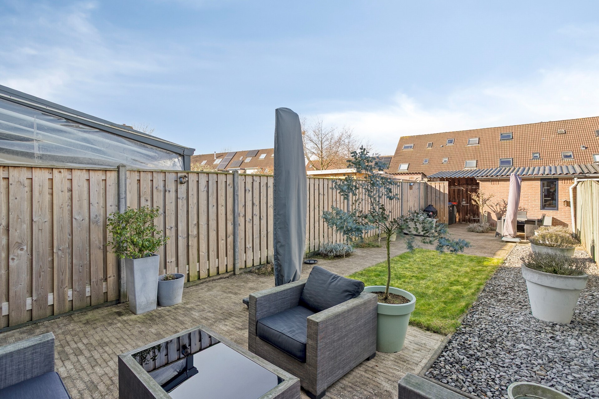 Diepe, zonnige & onderhoudsvriendelijke achtertuin gelegen op het westen. Met stenen berging en eigen achterom.